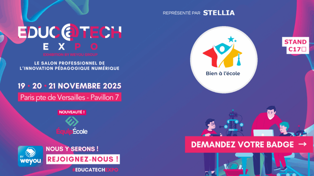 Le projet Bien à l’École, participera au salon Educatech Expo organisé les 19, 20 et 21 novembre à Paris, Porte de Versailles (Pavillon 7) et sera représenté par STELLIA sur le stand C17. Cet événement professionnel de référence réunit chaque année les acteurs engagés dans l’innovation éducative : collectivités, établissements scolaires, enseignants, associations, entreprises et partenaires institutionnels.